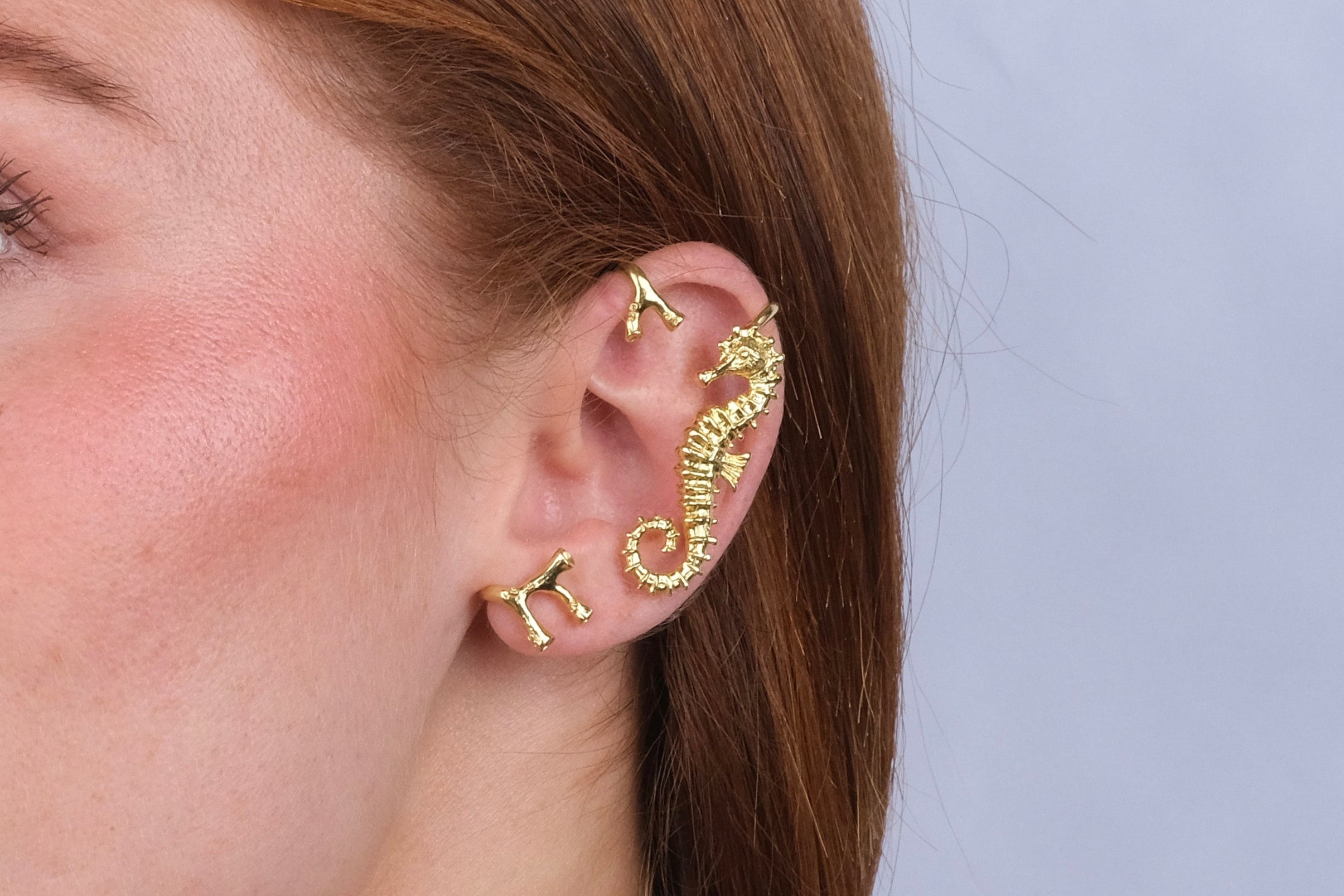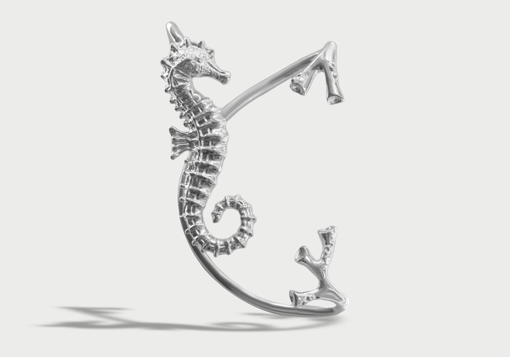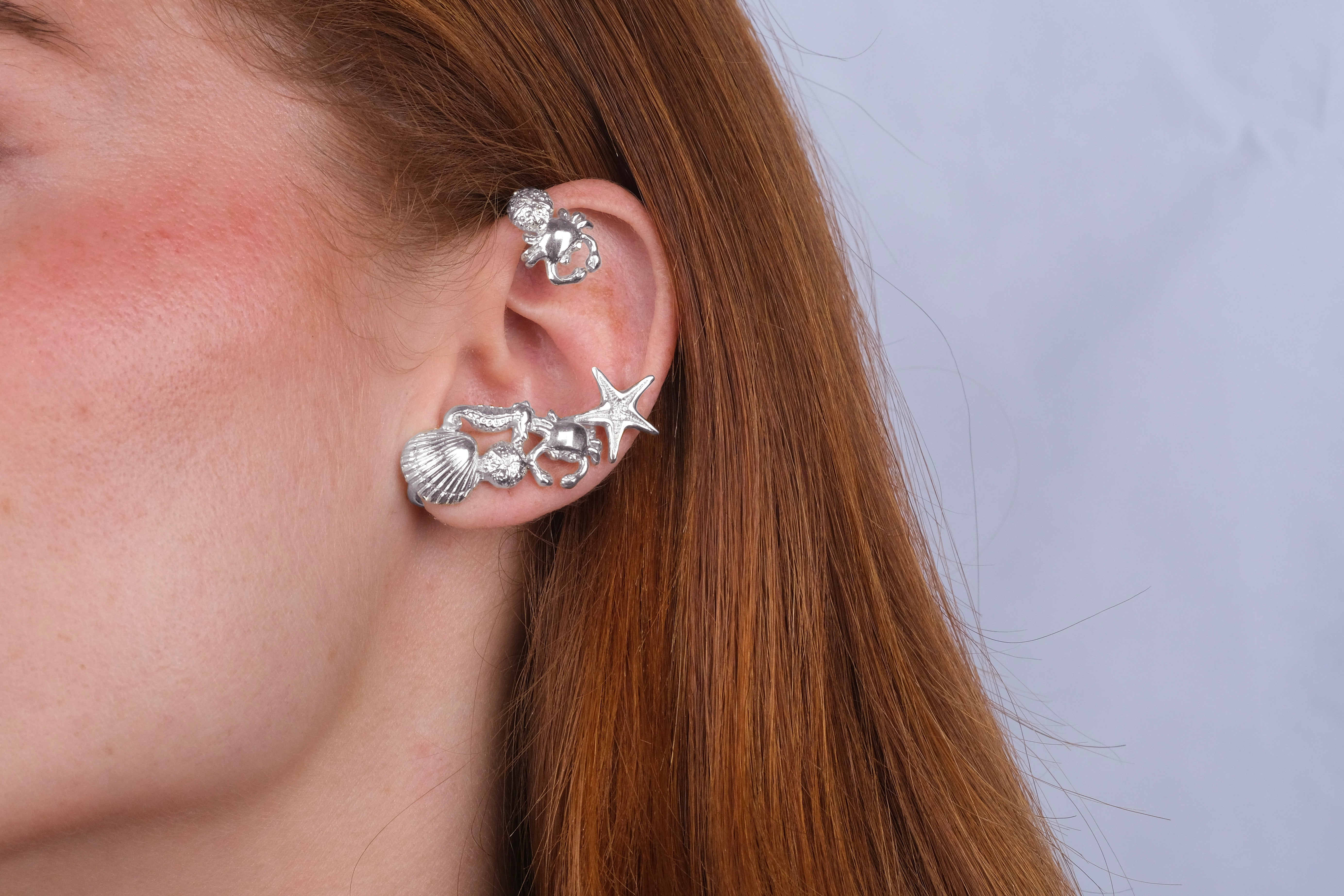 A collection of earrings, a necklace, and an ear cuff in 925 silver, inspired by the sea. A handcrafted Seahorse jewel.