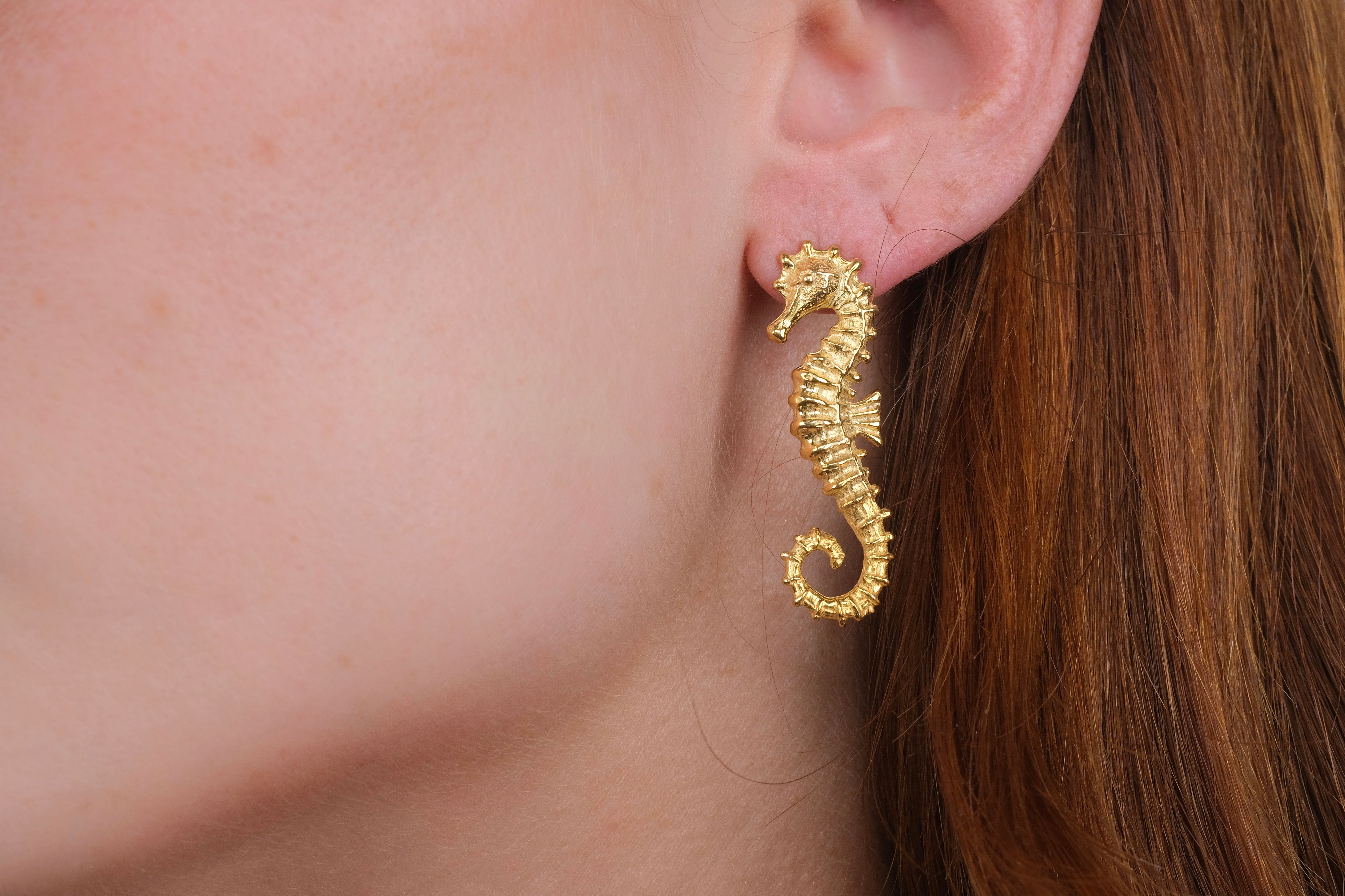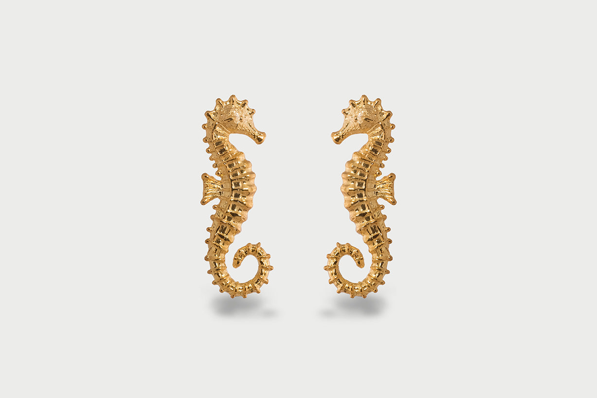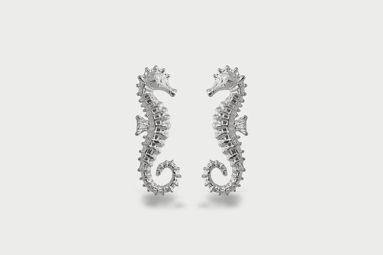 A collection of earrings, a necklace, and an ear cuff in 925 silver, inspired by the sea. A handcrafted Seahorse jewel.
