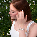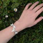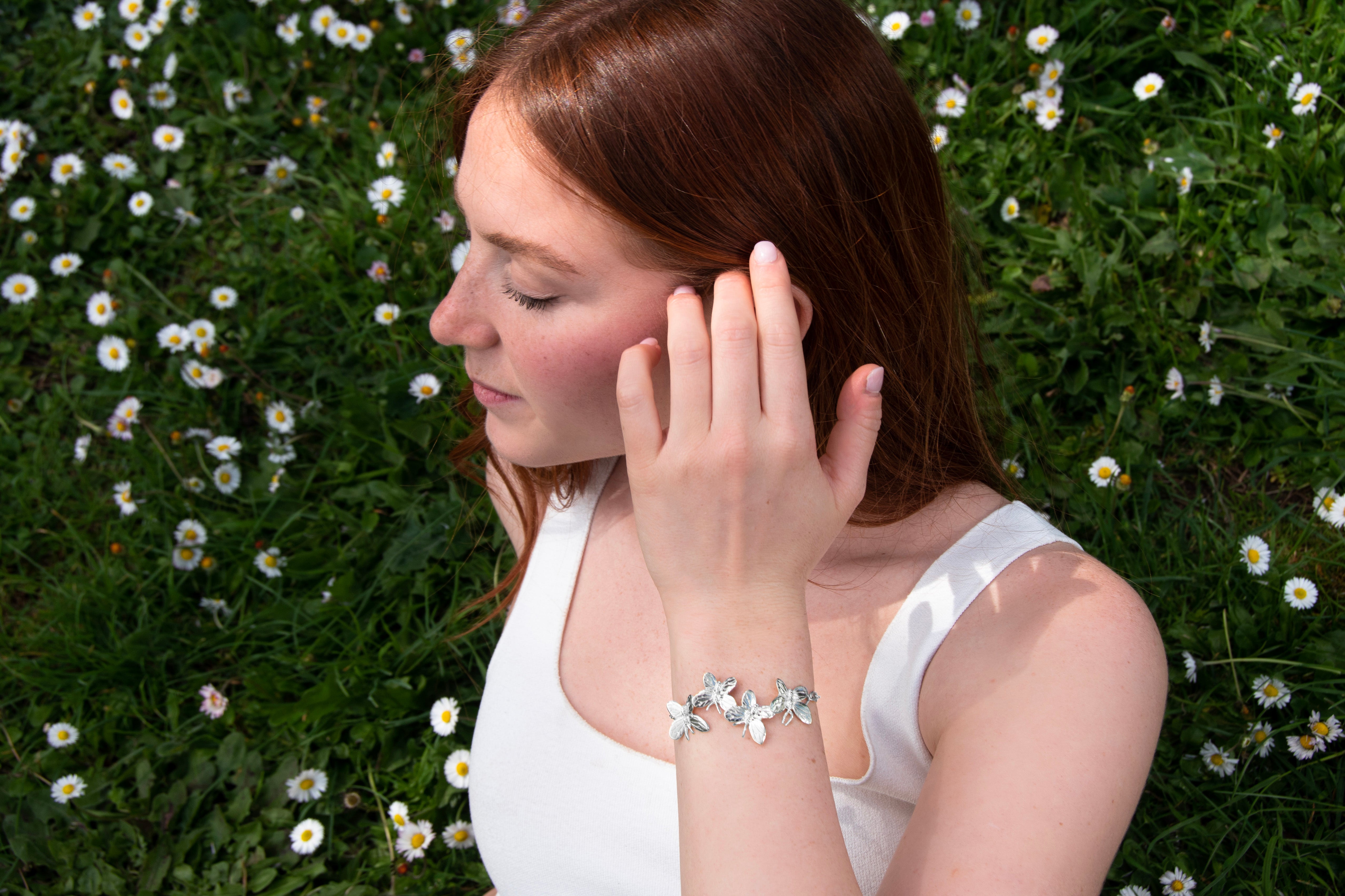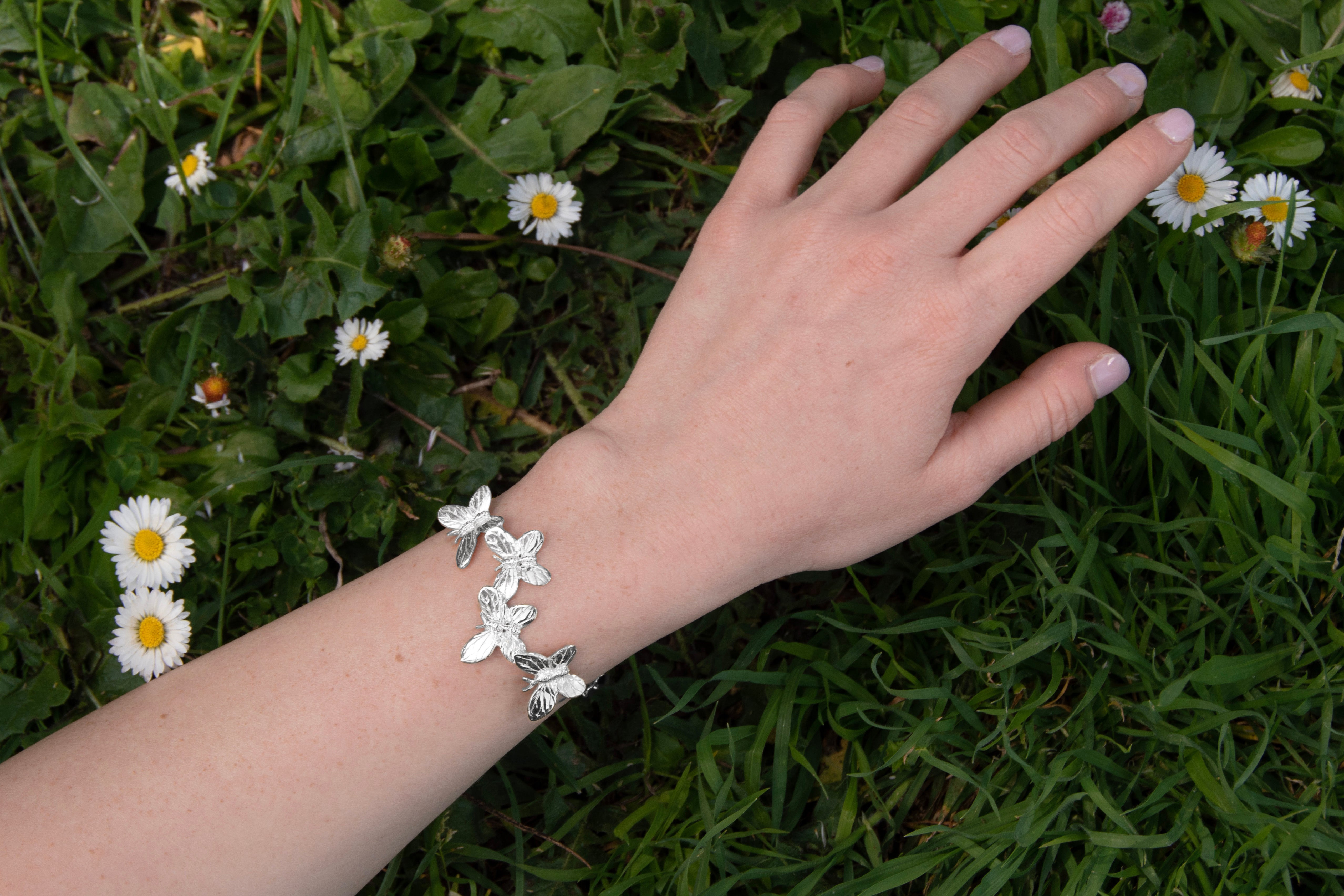 The Alisea Bracelet is handcrafted in 925 silver using the lost wax casting technique. The bracelet features a series of butterflies worked entirely by hand in every detail.