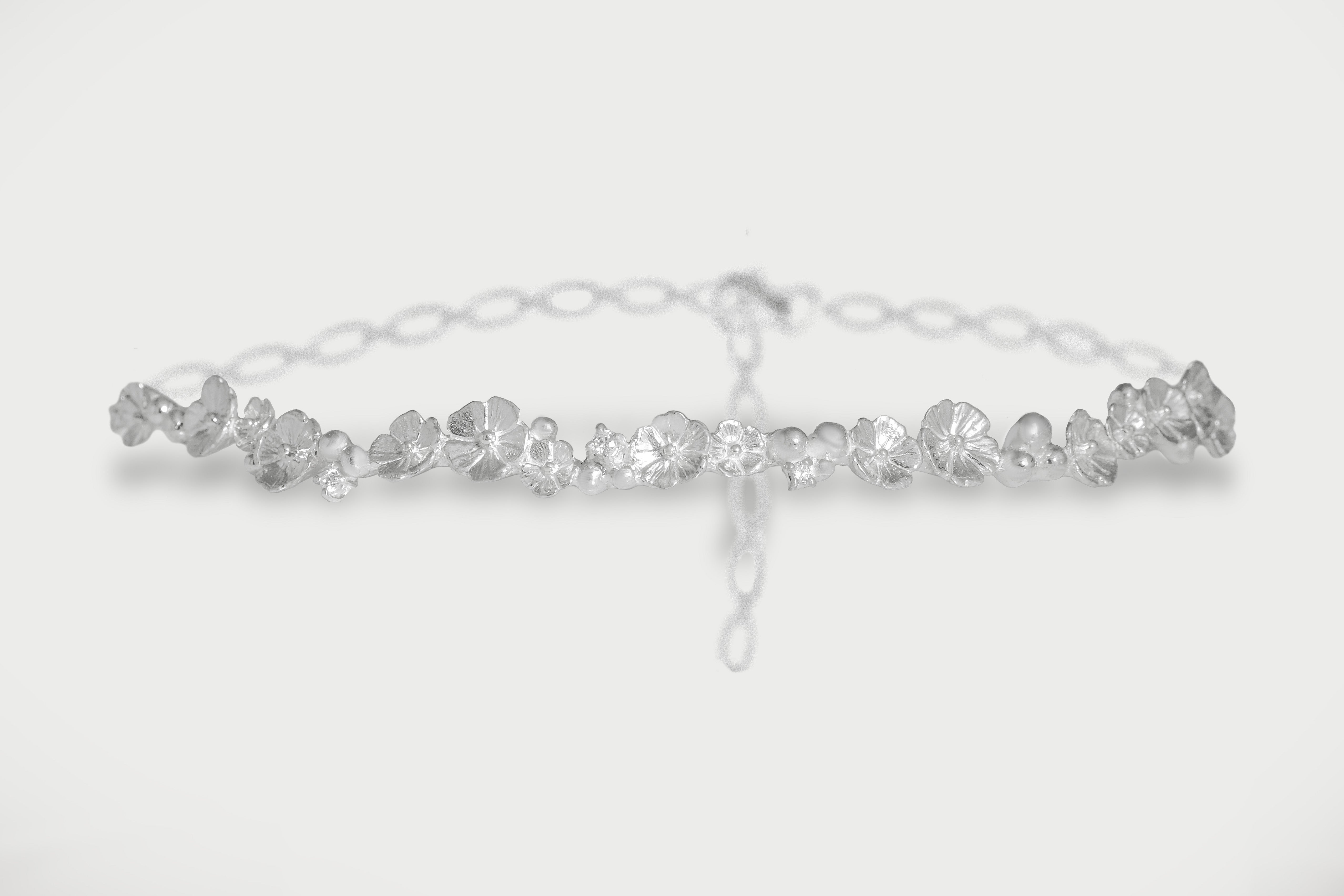 Choker con una composizione di fiori realizzata interamente a mano in argento 925 tramite la tecnica della fusione a cera persa.