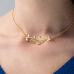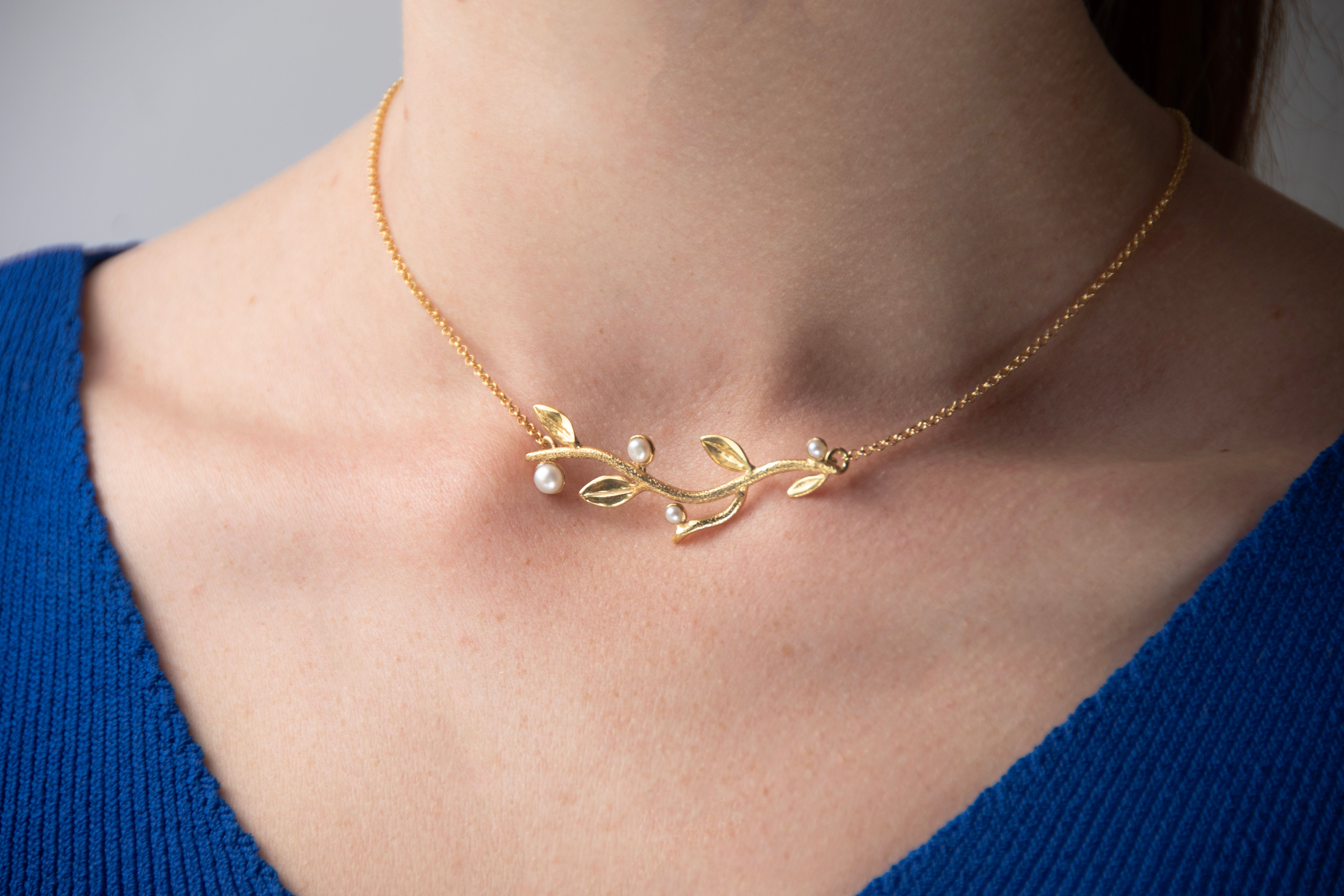 A magical necklace, where leaves and branches delicately intertwine, meeting river pearls. The necklace is handmade in 925 silver using the lost wax casting technique.
