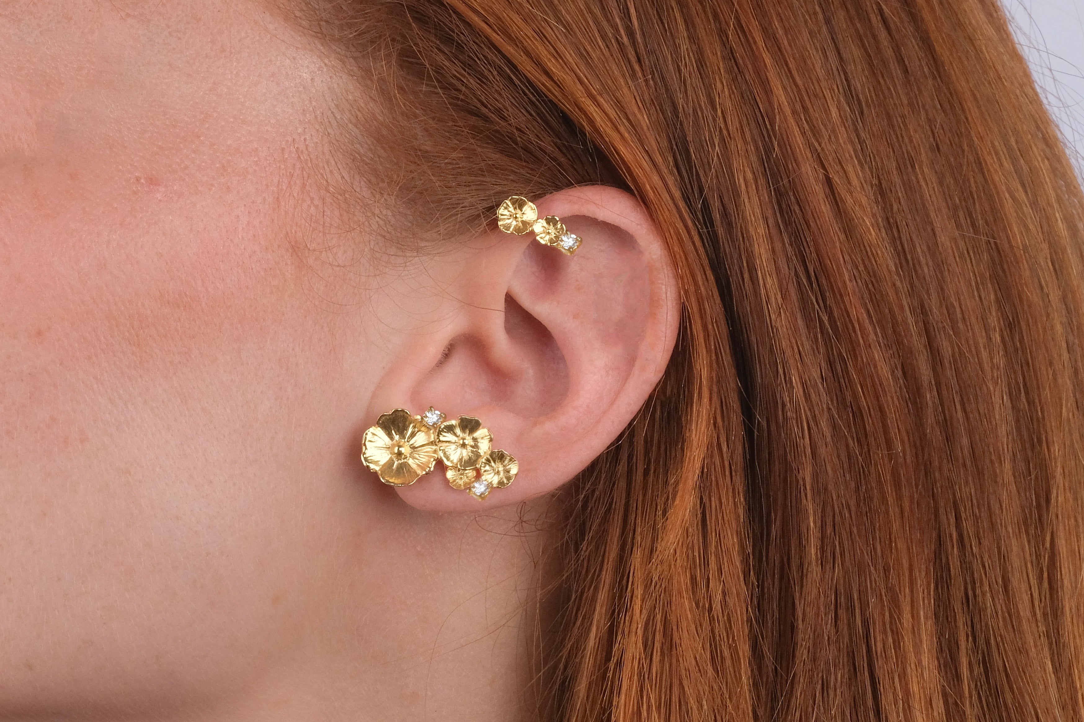 Una composizione di fiori impreziosita da punti luce avvolgono l'orecchio.