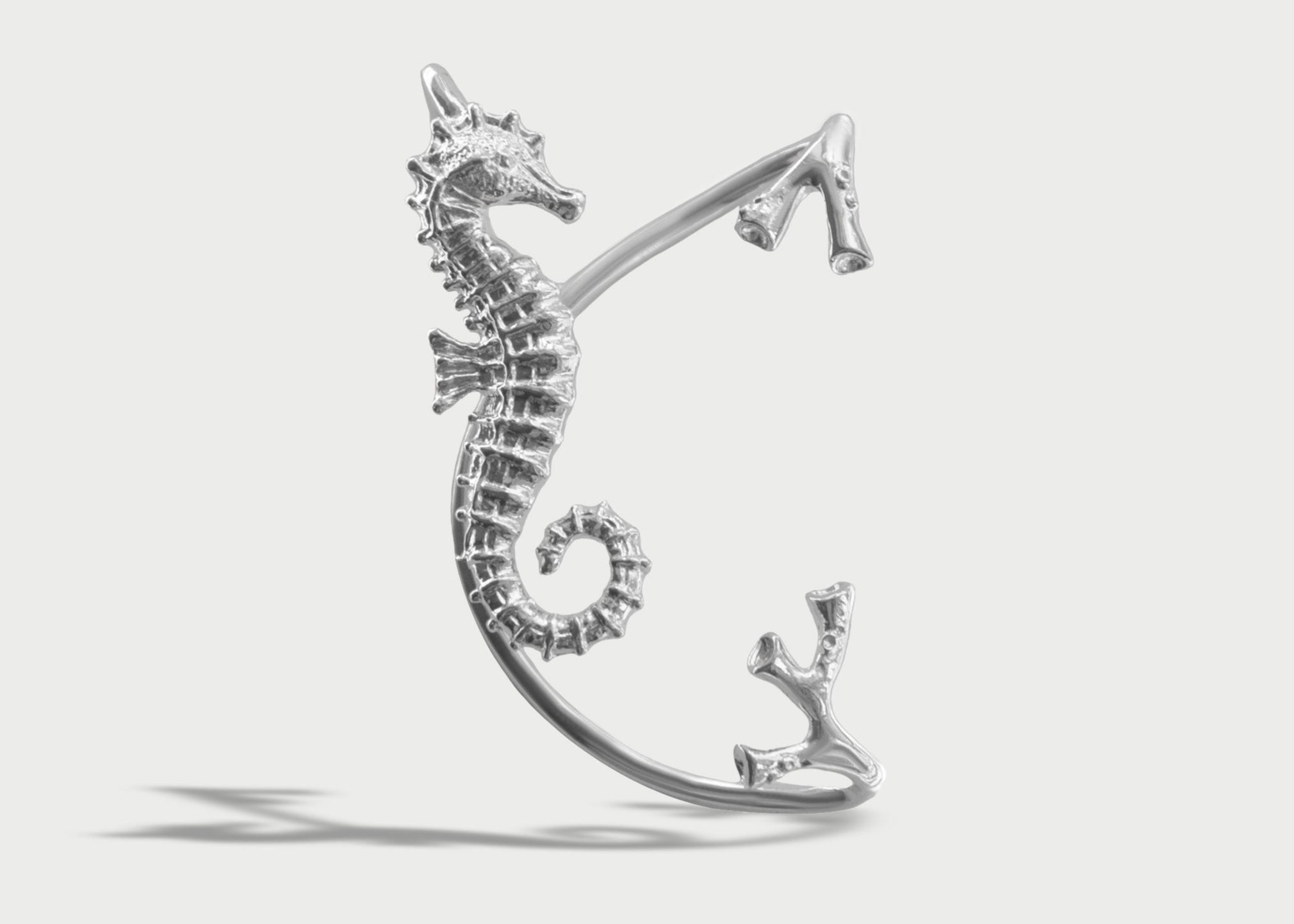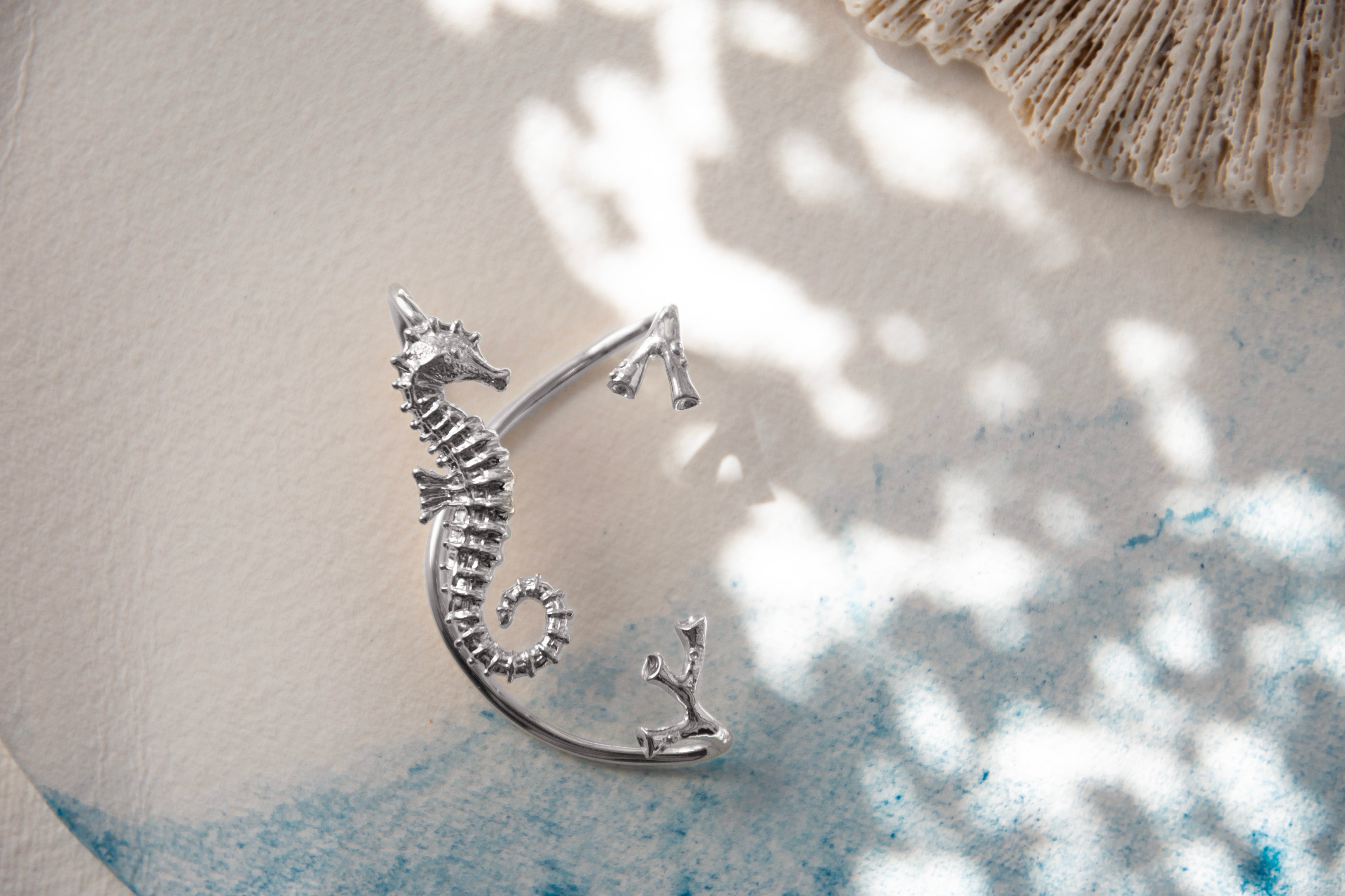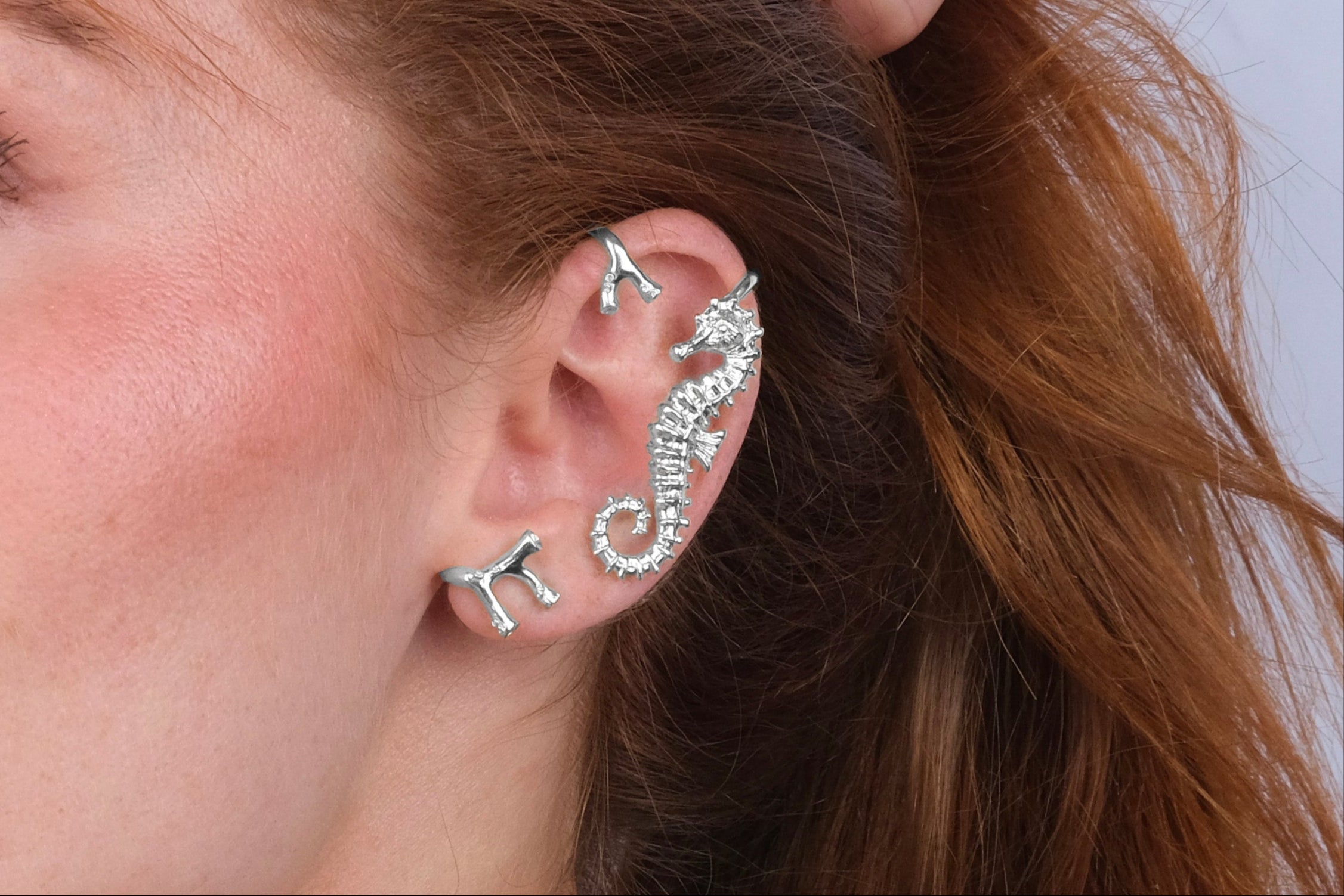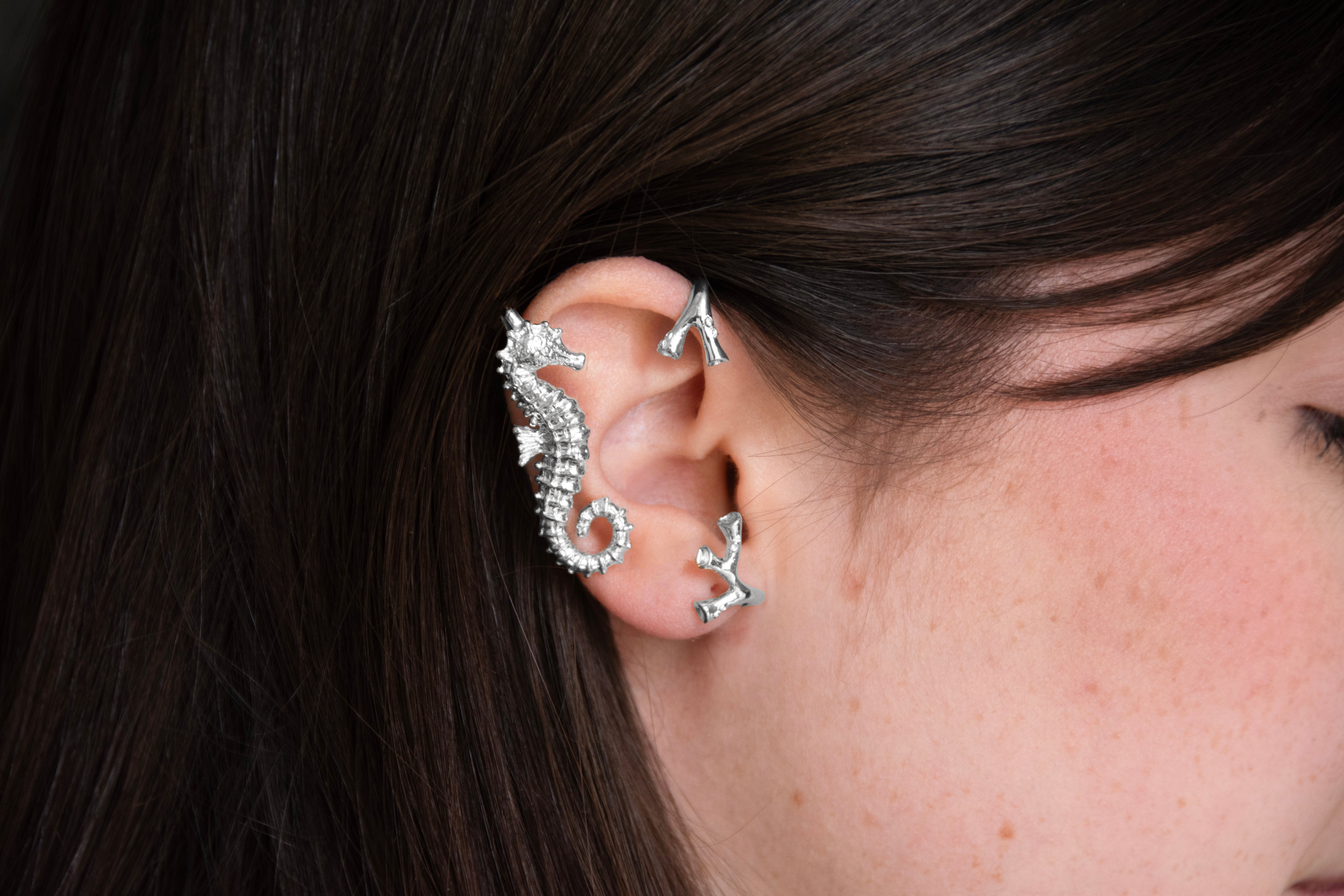 The Teti earrings represents a composition of starfish, shells, crabs, seahorses and urchins. They are handmade in 925 silver using the lost wax casting technique.