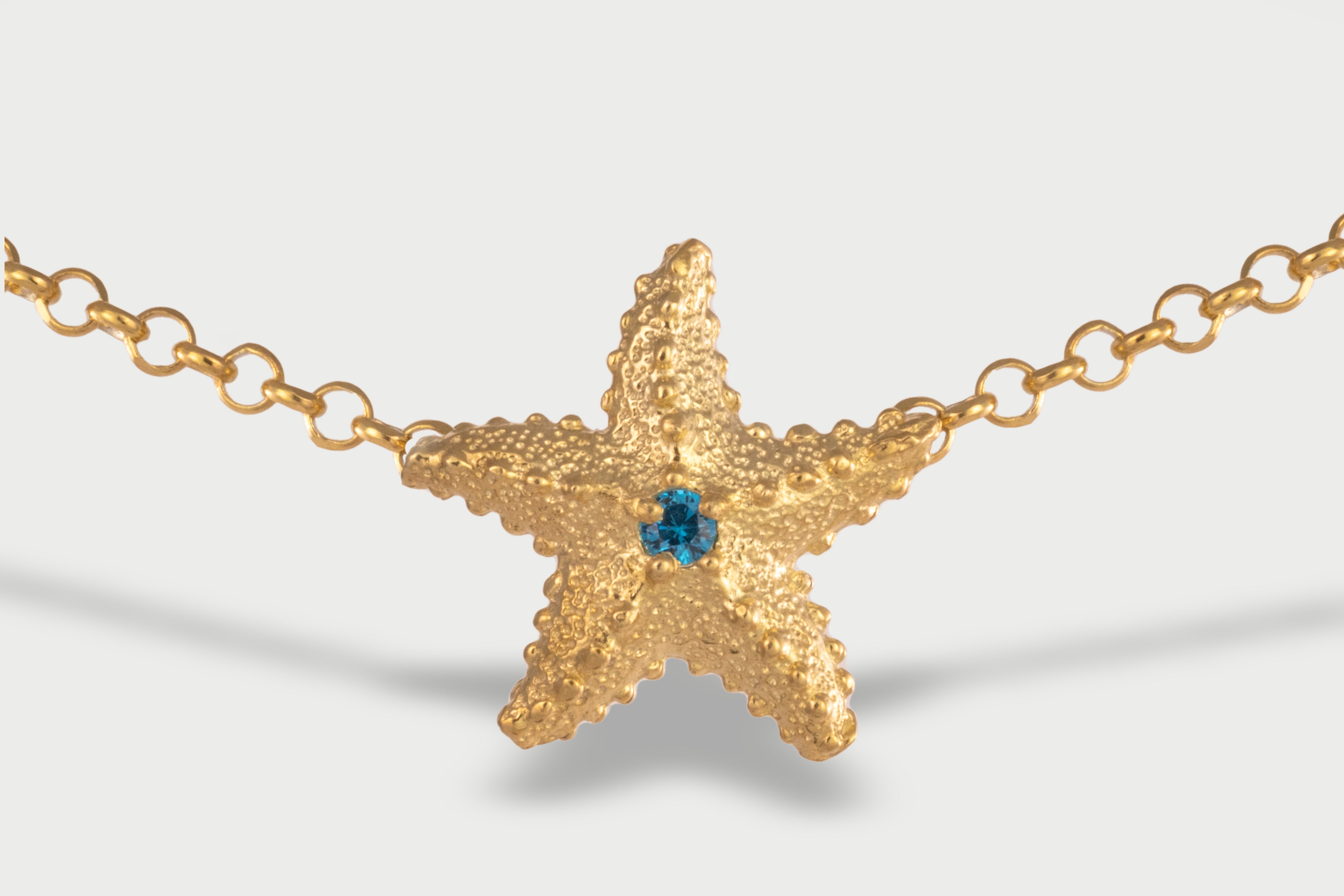 La Pulsera Criseide tiene un colgante en forma de estrella de mar realizado totalmente a mano en plata 925 mediante la técnica de fundición a la cera perdida.