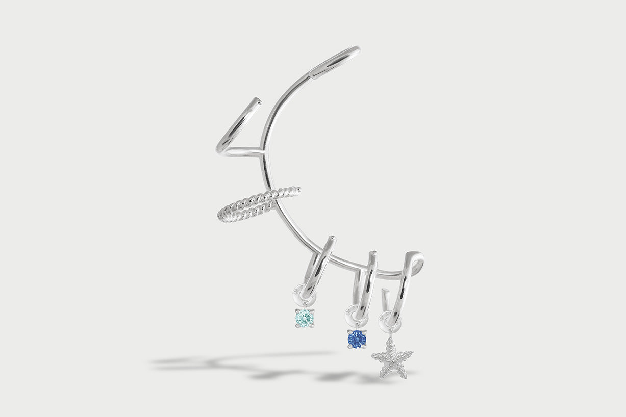 El Charm Chryseide con Estrella de Mar está diseñado para usarse con nuestro Ear Cuff Multi Hoops .. Puedes insertarlo fácilmente en los primeros cinco aros del Ear Cuff, personalizando tu look con un toque de brillo.