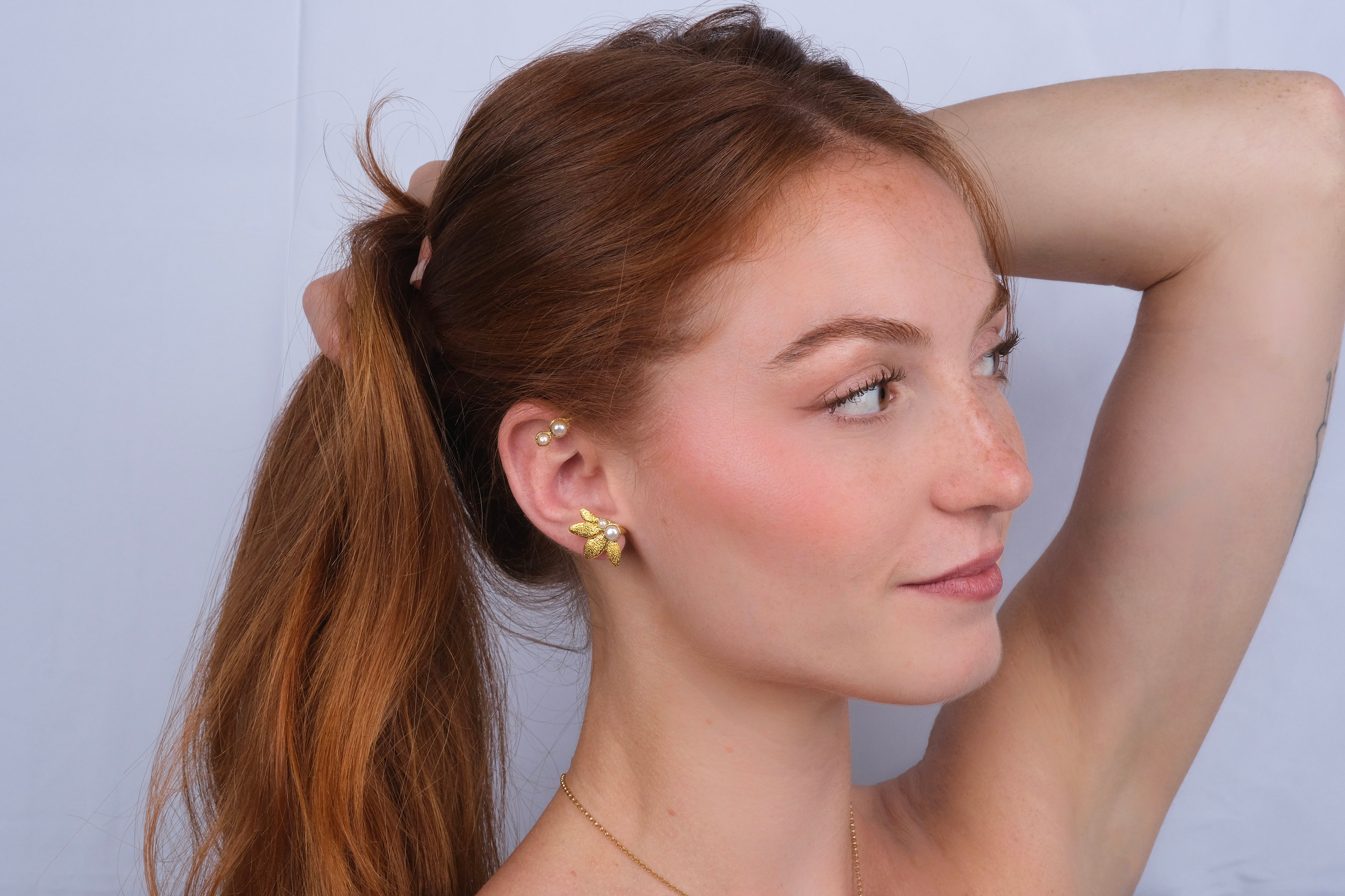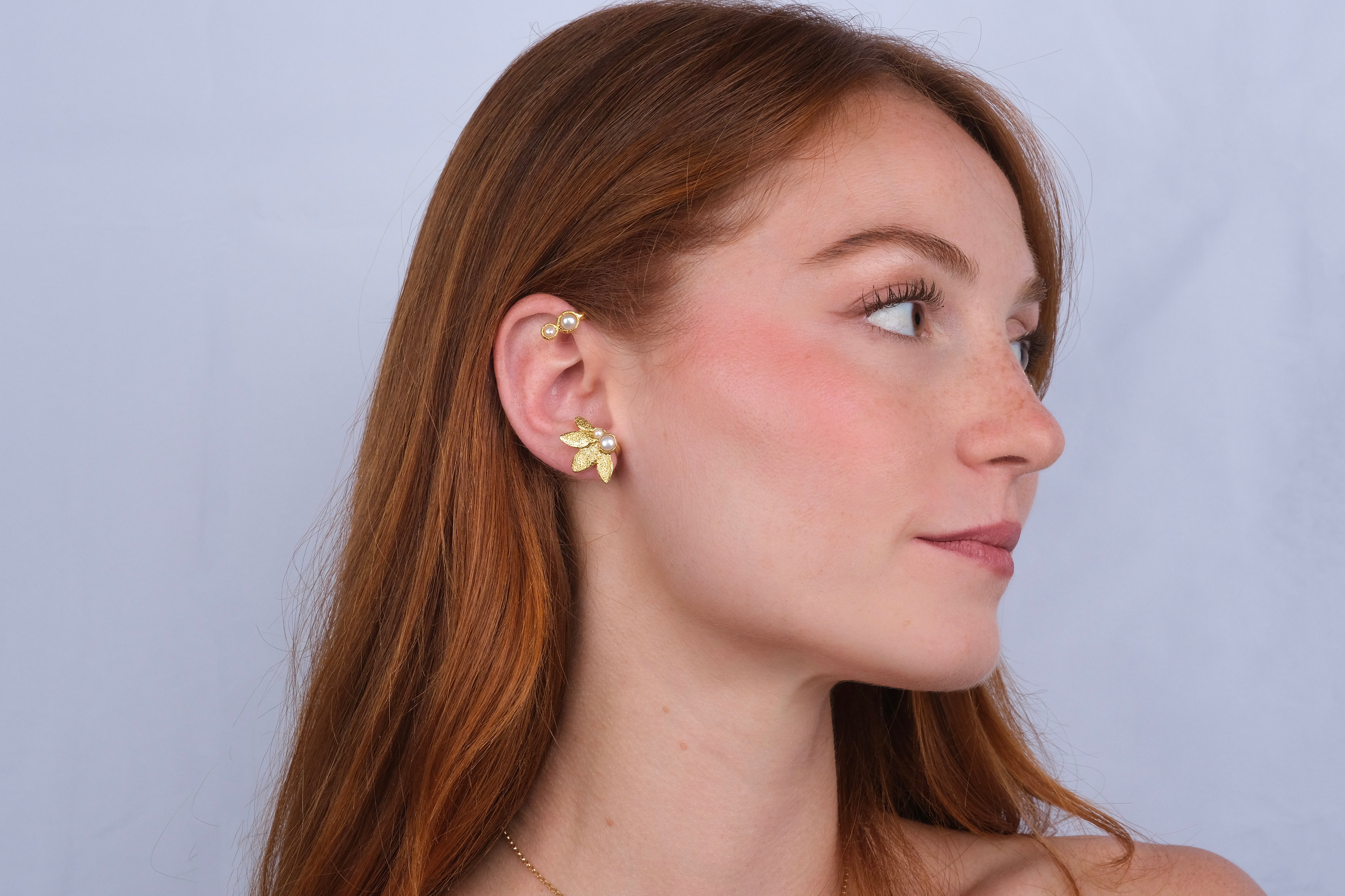 Una hermosa flor adornada con perlas de agua dulce que envuelve elegantemente la oreja.