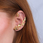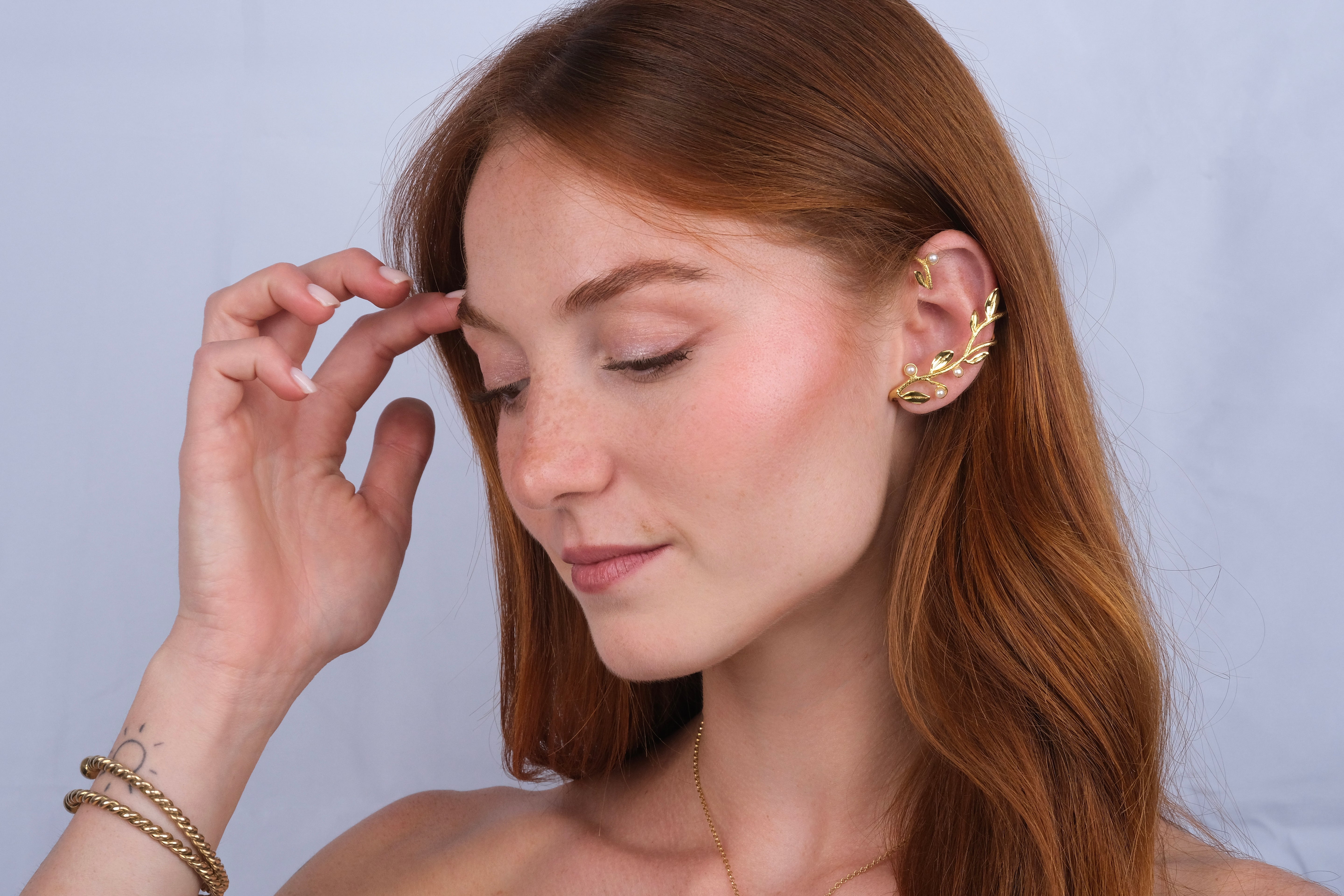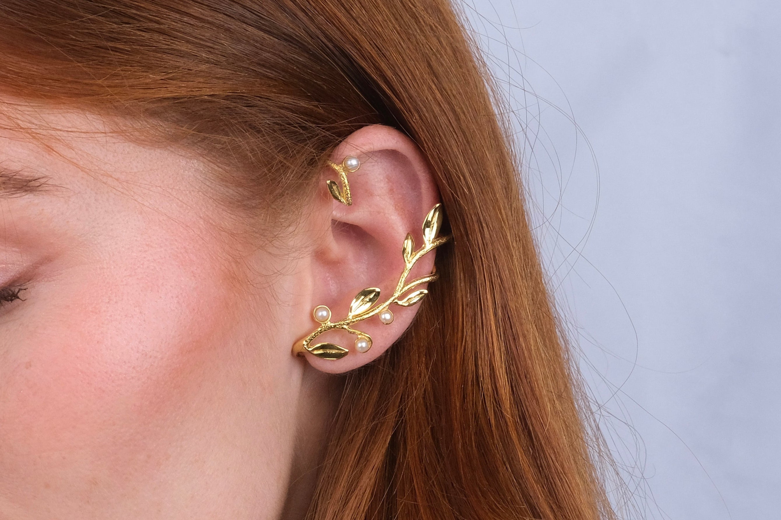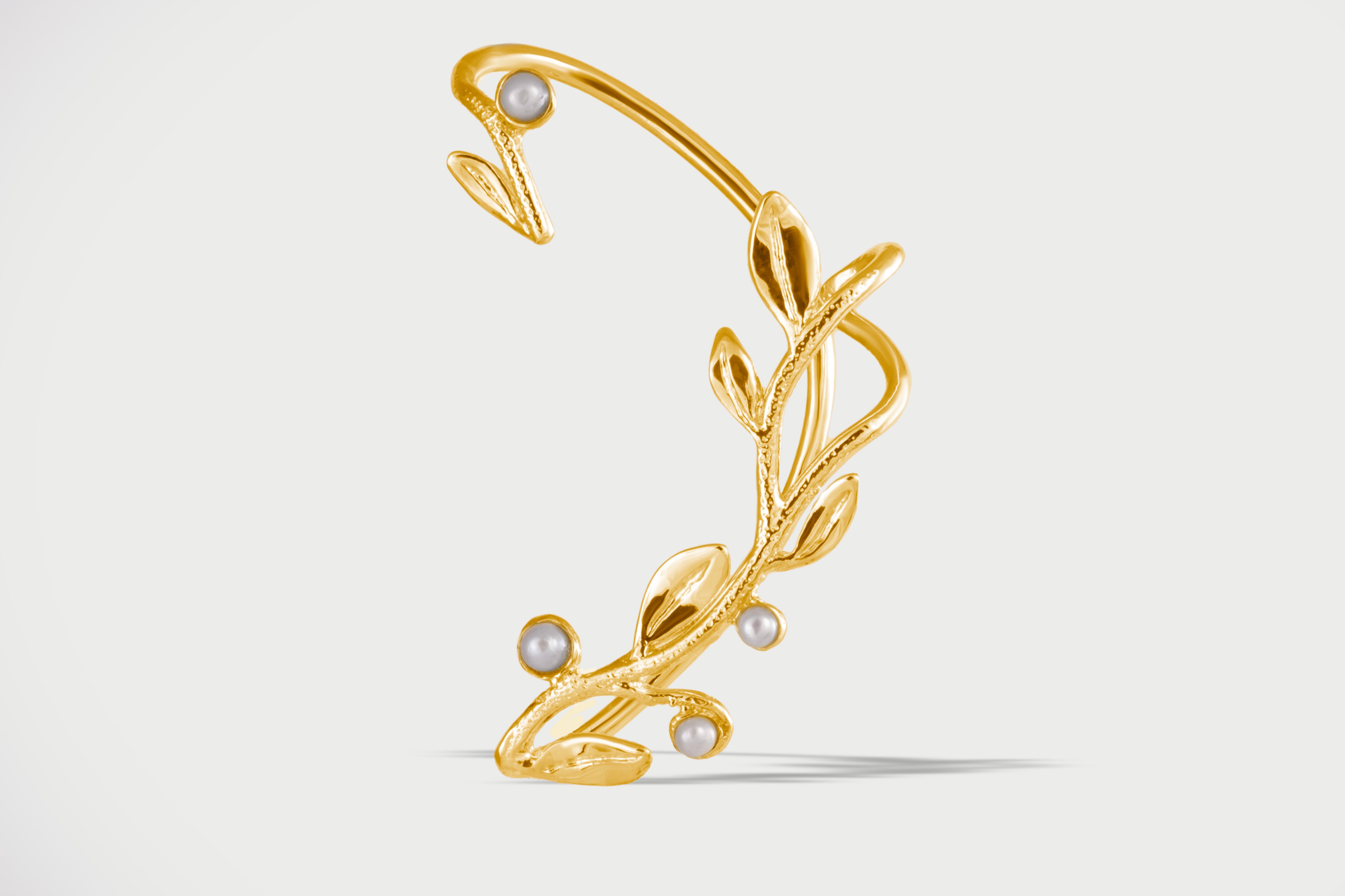 Un espléndido entrelazado de hojas y ramas adornado con perlas de agua dulce que envuelve elegantemente la oreja.